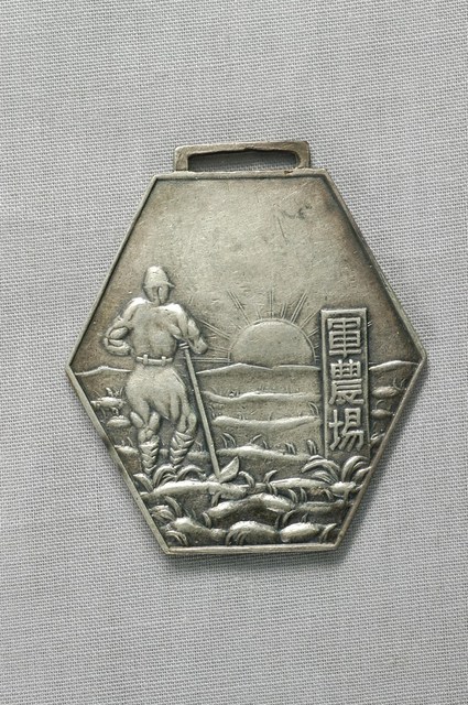 1.本件為昭和13年臺灣農業義勇團支那事變從軍紀念章,六邊形,金屬製造。正面有「昭和13年支那事変從軍記念」「第一次臺灣農業義勇團」字樣,背面有軍農夫鋤地望向太陽,旁有「軍農場」字樣。2.1937年7月7日發生中日戰爭,中國稱為「七七事變」或「盧溝橋事變」,日本稱「支那事變」。1938年「臺灣農業義勇團」成立,成員大部分是公學校農業傳習所的畢業生,前往中國戰場生產糧食、蔬果,以解決日軍的補給問題,雇用期限1年。3.紀念章的製作,是為了表示對某一事件的產生之思念不忘。