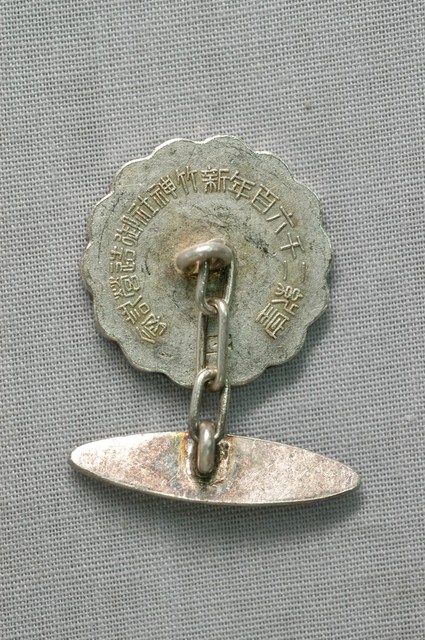 本件金屬製圓形花紋新竹神社興建紀念章,正面圖案為5瓣菊紋疊在5瓣菊紋上,周邊則是14辮的圓弧所框成的邊。背面有「皇紀二千六百年新竹神社御造營紀念」等圓弧字樣,中間有一個圓紐,掛著一條由3個楕圓形鐵圈所組成的鏈條,尾部帶有一個一字形的掛頭。