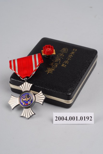 本物件日本紅十字會金色有功章,內容為一個外盒,內有2枚勳章,外盒上方有「日本赤十字社金色有功章」字樣。金色有功章是頒授予參與該會20年以上之成員,或捐款超過50萬日圓等,對紅十字會貢獻者。