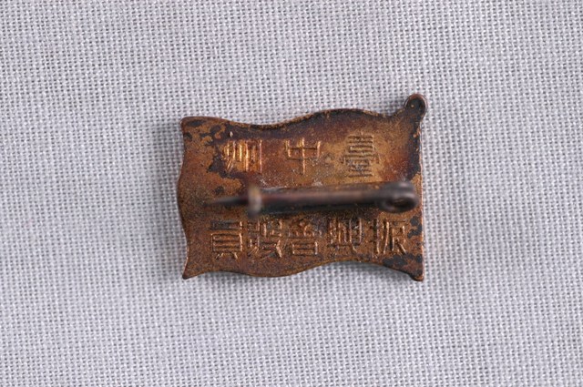 此為日治時期臺中州振興會所使用的金屬製紀念章,表面以日本國旗,背面則有「臺中州振興會役員」之字樣。 日本於第一次世界大戰過後,雖因戰爭的需求導致日本的經濟一時間成長,旦因為一連串的經濟恐慌,導致農村凋敝,在此情形之下,日本政府在1931年開始推行「農村經濟更生運動」,而在同年的臺灣,便推出「部落振興運動」,做為更新運動的一環。 此項運動的主要組織設立於基層行政組織「部落」,「部落」下屬於「街庄」,並設立多種組織,在1934年後大多通稱「振興會」。振興會的主要目的,為振興社會教化、開發產業、改善農家經濟、促進生活改善、將部落民促成共同體,因民情不同,因此各地振興會的實際活動皆有不同,如:普及國語、設置神棚(日式神龕)、共同採購肥料、共同運銷農產品等等。
