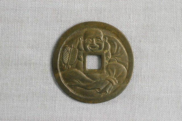 本物件為金屬繪錢1枚。繪錢樣式外圓內方;正面順時針刻有「ほ」、「い」、「て」、「屋」4字;背面刻有1微笑七福神的布袋和尚圖像。