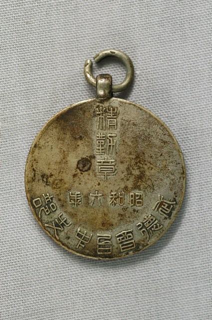 1. 本物件正面有龍的圖樣以及「劍」字樣,背面有「精勤章 昭和六年 武德會台中支部」字樣。2. 精勤章為日本政府對於政府軍隊以及公家機關職員勤勉勤奮工作所表彰的勳章。