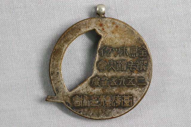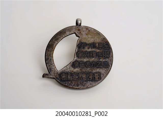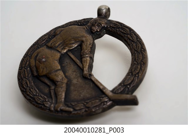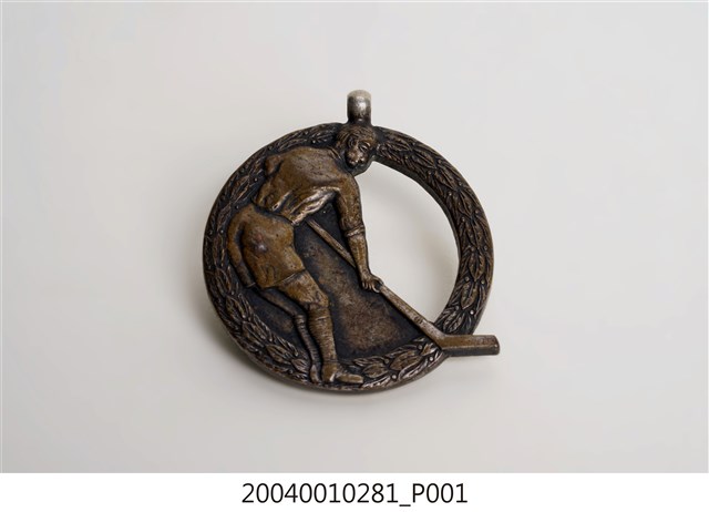 1.本物件為全島ホッケイ選手權大會紀念徽章,此物件為鏤空環形,上方設計一圓形環,可做成吊飾或項鍊等其他運途。正面刻有一名曲棍球選手打球的姿態,環上有桂冠頁的紋飾,桂冠葉象徵榮譽,背面表面有許多汙漬,刻有「全島ホッケイ選手權大會」、「二五九五年度」「臺灣體育協會」等字樣。2592年度為日本皇紀年,同西元1935年。