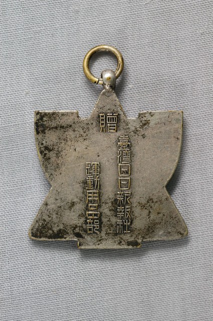 1.本物件為臺灣日日新報社運動用品部贈優勝紀念徽章。此物件為三角形搭配獎盃的造型,上方設計一圓形環,可做成吊飾或項鍊等其他運途。正面獎盃上刻有英文「VICTORY」:勝利的意思及桂冠葉圖案,桂冠葉亦有勝利榮耀的含意。背面表面有刮損及汙漬,印有「臺灣日日新報社運動用品部贈」字樣。
