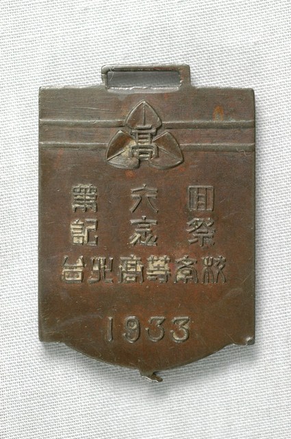 本件為昭和8年(1933)臺灣總督府臺北高等學校第六屆畢業紀念會章,金屬材質,四邊形。正面刻有人物浮雕,背面則刻有校徽與「第六回記念祭」、「1933」字樣。 臺北高等學校於大正11年(1922)設立,校址為今日臺灣師範大學,屬於七年制的高等教育機關(尋常科4年、高等科3年),同時具有高等普通教育與大學預科的性質,透過通才教育培養學生高等基礎知識與博學素養,並重視外語訓練。除少數需要通過入學測驗的帝國大學外,臺北高校畢業生得免試直升日本各帝國大學。