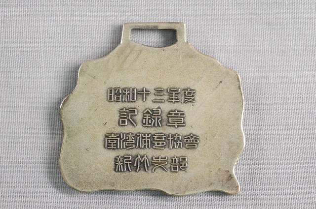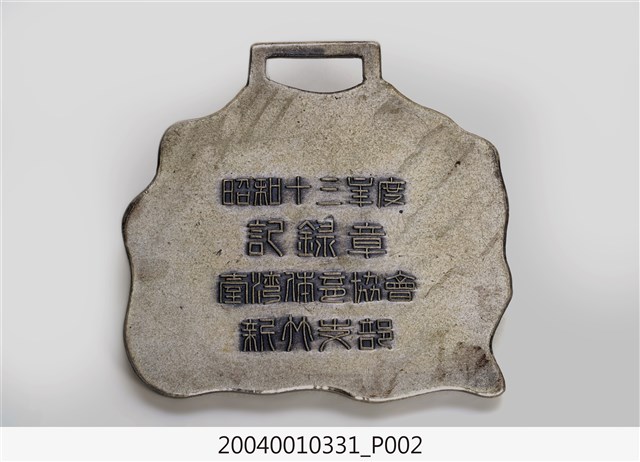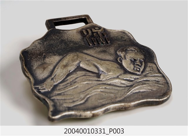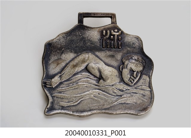 本件為昭和13年(1938)臺灣體育協會新竹支部頒發之游泳記錄獎章,金屬製。正面有人物游泳浮雕圖案,上方刻有「泳」字樣,背面則有「昭和十三年度 記錄章」、「臺灣體育協會 新竹支部」字樣。 本件所指涉之事件為昭和13年(1938)7月11日,由臺灣體育協會新竹支部舉辦的水上競技會(游泳比賽),地點為新竹新公園游泳池,參加者分為小公學校學童、中等學校學生、一般民眾三類。