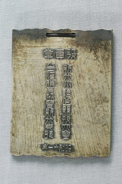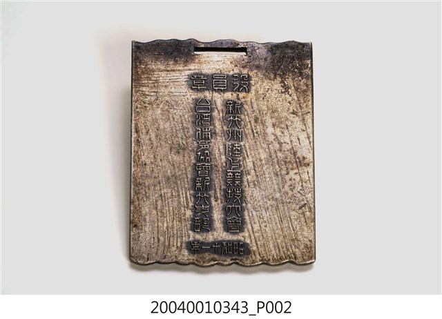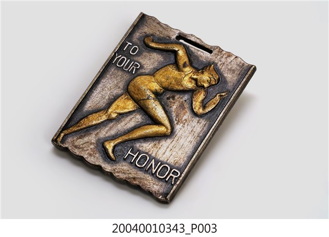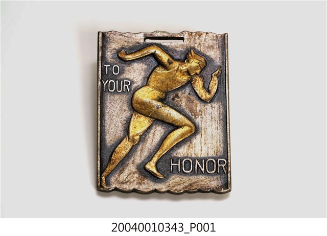 本件為昭和11年(1936)新竹州陸上競技大會役員章,金屬材質,四邊形。正面有人物衝刺跑步之浮雕圖案,並刻有「TO YOUR HONOR」字樣,背面則有「役員章」、「新竹州陸上競技大會 臺灣體育協會新竹支部」、「昭和十一年」等字樣。 本物件所指涉之事件應為昭和11年(1936)10月25日,由臺灣體育協會新竹支會所舉辦之新竹州陸上競技(田徑)大會,地點於新竹市新公園運動場,參加者有學校教職員、青年體育會員(以中等學校學生為主)、一般市民三種身分。