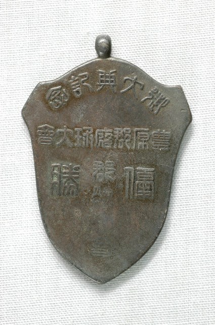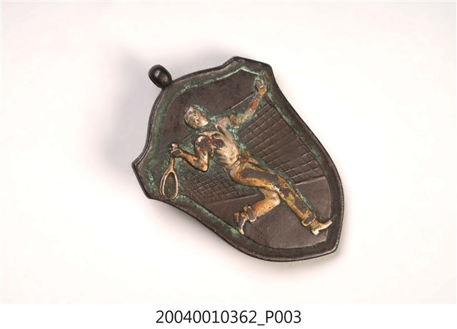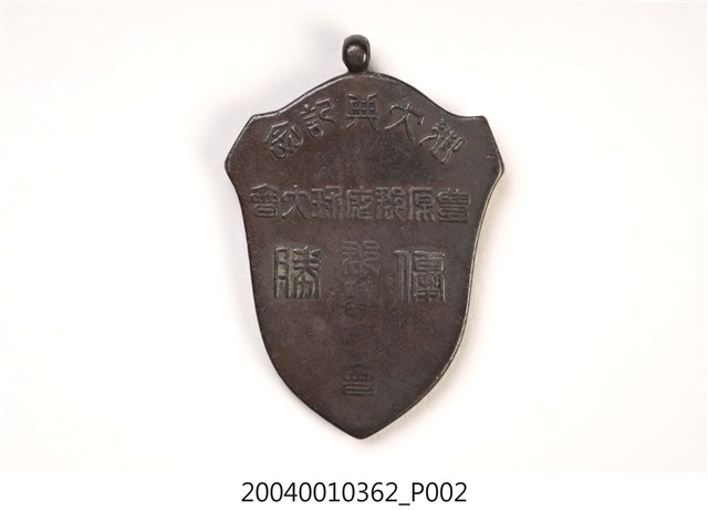 1.本物件為豐原郡庭球大會優勝紀念徽章。此物件為盾牌造型,上方設計一圓形環,可做成吊飾或項鍊等其他運途。正面圖示為一網球選手打球的姿態。背面表面有汙漬,刻有「鄉大典記念」、「豐原郡庭球大會」、「優勝」字樣,中間下半部應還有一行文字,但已經磨損不易辨識。「庭球」為網球。