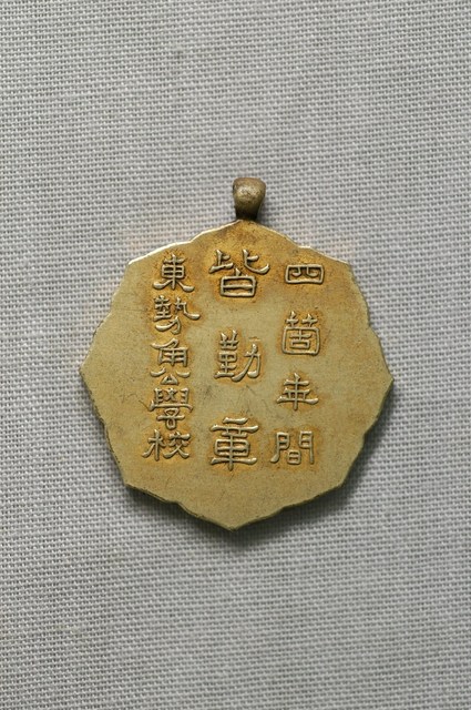 本件為東勢角公學校全勤獎賞章,金屬材質。正面有月桂葉、花紋浮雕圖樣,並有「誠」字樣,背面則有「四箇年間 皆勤章」、「東勢角公學校」等字樣。 東勢角公學校(今臺中市東勢國民小學)創立於明治31年(1898),前身為臺中國語傳習所東勢角分所,大正10年(1921)更名為東勢公學校。