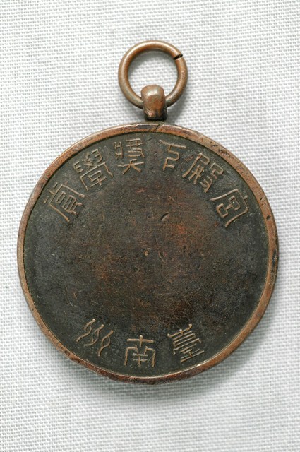 本件為臺南州之獎學徽章,金屬材質,圓形。正面有孔雀圖案與「賞」字樣,背面則有「宮殿下獎學賞」、「臺南州」等字樣,推測「宮殿下」可能指北白川宮能久或閑院宮載仁兩位親王。