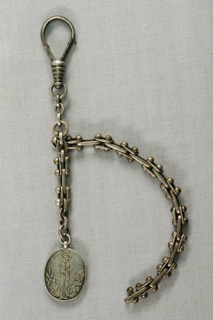 1.本物件為金屬壓扣鍊紀念章1個。壓扣鍊掛有1條金屬鍊帶及1個橢圓形金屬牌,金屬牌正面刻文字「大正四年十月一日」、「開業十周年記念」;背面刻文字「彰化銀行」,及1個「S」和「||」組成的貨幣符號,2側刻有菊花、櫻花的圖紋雕飾。
