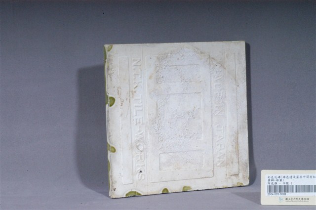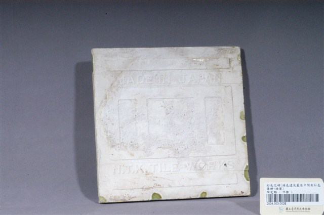 本件磁磚以中央為核心,往四邊以卷草紋為邊構成四瓣花塊面,塊面內為淺藍色,以外即磁磚四角則為綠色。磁磚中心的主要圖案為粉紅色牡丹(富貴),屬中國傳統吉祥紋樣類型。邊框則為西式圖案。磁磚背面有「NTK」公司蜻蜓商標、「N.T.K. TILE-WORKS」與「MADE IN JAPAN」字樣,為日本歧阜縣的日本TILE工業株式會社(NIPPON TILE INDUSTRIAL CO., LTD.)所製。本件磁磚一角缺損,邊緣釉料有少許剝落,背面邊緣有沾染部份綠色釉料,與館藏號2004.003.0024-0025為相同產品。