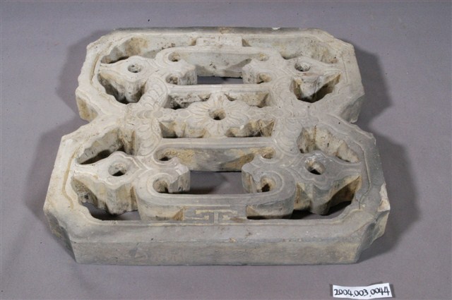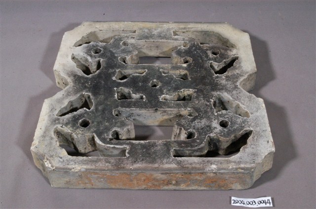 本件文物為水泥花磚,仿傳統琉璃花磚尺寸及圖案配比製作。本件花磚外層使用白水泥,內層為本色水泥,圖案非傳統琉璃花磚典型圖案,但仍採取以中心為主圖案的配比方式,中為六瓣花,兩側為蝴蝶,線條非傳統風格,為戰後所製。本件水泥花磚曾於建築上使用,可能為傳統建築修建時用來取代傳統琉璃花磚位置。