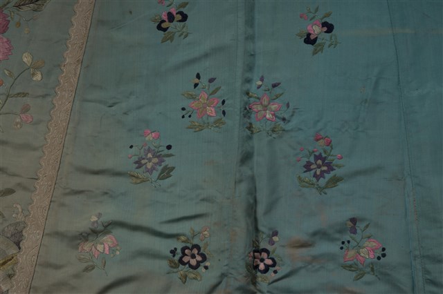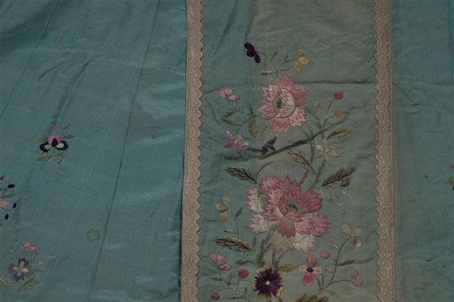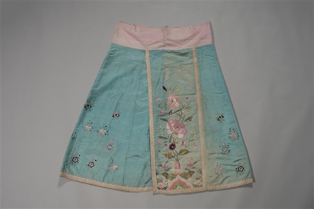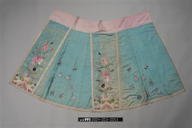 馬面裙是清朝時期漢族婦女的傳統裙式,整個裙子展開來是一片裙的形式,以兩片大小、花色、圖案相同的布幅製作而成,以腰帶連綴、兩側以綁帶固定裙腰,前後各有一長方形裙門為重疊之開口,裙門為刺繡花紋之重點,俗稱為「馬面」,因此稱為「馬面裙」 。此裙為藍色絲質材料製作,腰頭為粉紅色棉布接縫,裙門和下襬的分隔以蕾絲織帶飾邊,裙門為刺繡的重點,以絲線彩繡折枝花卉以及海水江芽、五彩立石等紋飾,是仿官員夫人禮裙上的紋飾,海水江芽、五彩立石象徵「江山一統、四海昇平」,是清代皇室、官員以及誥命夫人禮服下襬的重要紋飾。此件馬面裙兩側形式單純,沒有細細的百褶來增加行走的活動量,加上蕾絲織帶飾邊的形式咸少出現官服禮裙上,推測此件馬面裙不是正式禮裙,而是一般富貴家庭小姐的裙子。