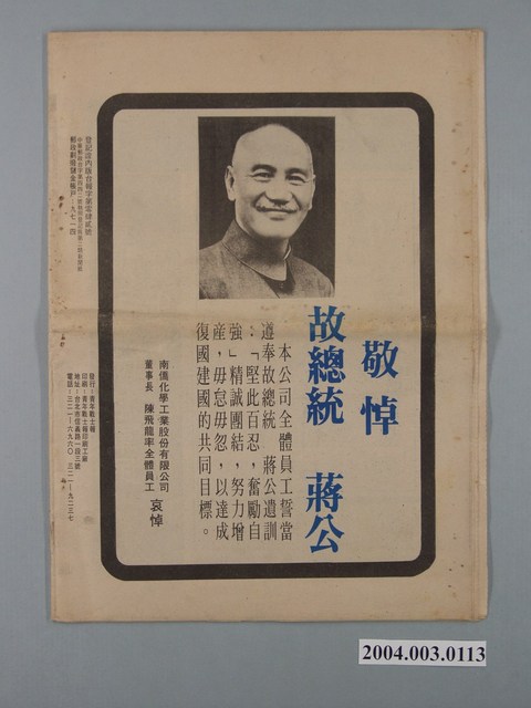 此物件為《總統蔣公奉厝大典特刊》,印行單位為「青年戰士報」,發行日期為1975年4月16日,封面以總統蔣公靈堂相片為主,印有「實踐三民主義,光復大陸國土,復興民族文化,堅守民主陣容」字樣。 此件文物的主要人物為蔣中正,生於1887年10月31日,浙江奉化人,原名瑞元,後改名中正,字介石,擔任中華民國自行憲開始的第一至第五任總統,並連續擔任中國國民黨總裁。蔣中正早年考送日本振武學校,並在1907年加入中國同盟會,其後參加孫文的中華革命黨,在「六一六事變」後成為孫文心腹,並且參與創建黃埔軍校。孫文死後,蔣中正擔任北伐總司令,率領國民革命軍成功北伐,領有中國大部份領土,後於1937年率軍對抗日軍侵略,並獲得勝利。1949年,中國國民黨在第二次國共內戰中失利,蔣中正和中國國民黨政府撤退臺灣,在臺發布《動員戡亂臨時條款》,實行長達38年的戒嚴令。臺灣社會在戒嚴時期經歷了沉重的權威專制,史稱「白色恐怖」。蔣中正於1975年4月5日去逝,其對於中國近代史以及東亞史發展有著深刻影響。 《青年戰士報》創辦於1952年,原為國防部政治總部內部刊物,1957年起轉型為公開報刊,並於1984年改名為《青年日報》。2007年,配合軍隊國家化政策,《青年日報》的報導路線由「綜合報紙」轉型為「國防軍事專業報」,專注於全民國防意識之推廣。
