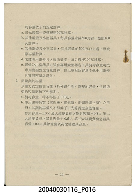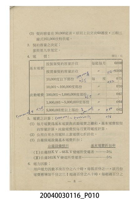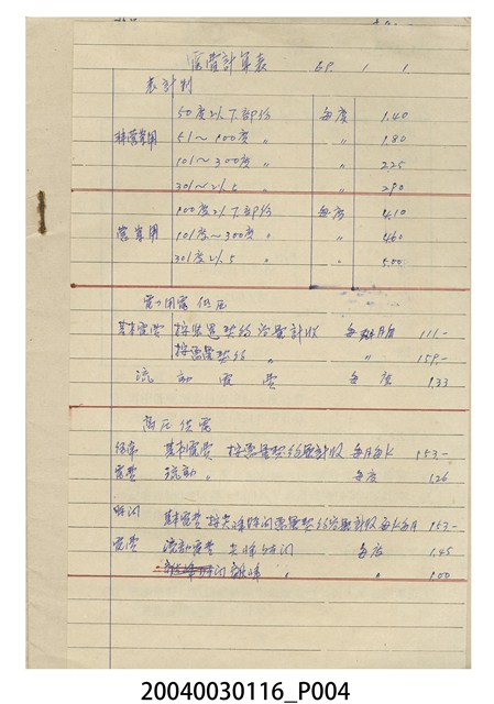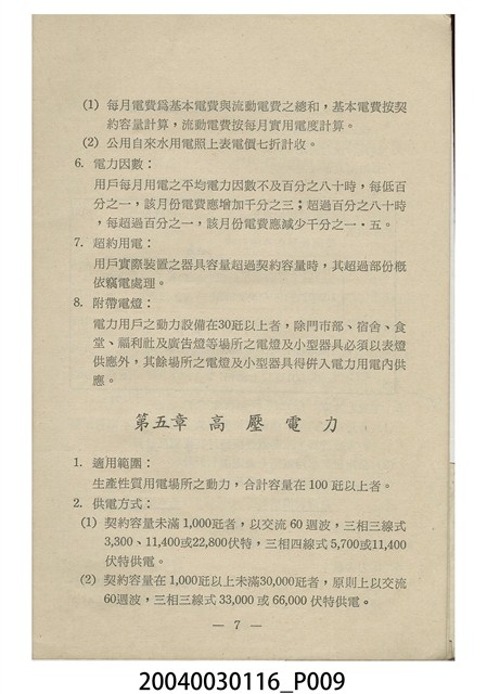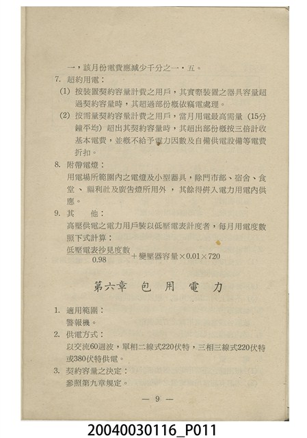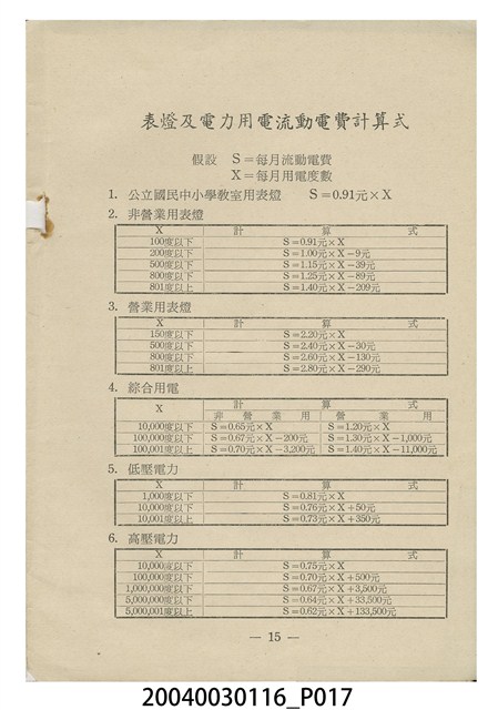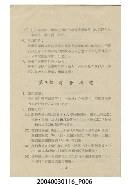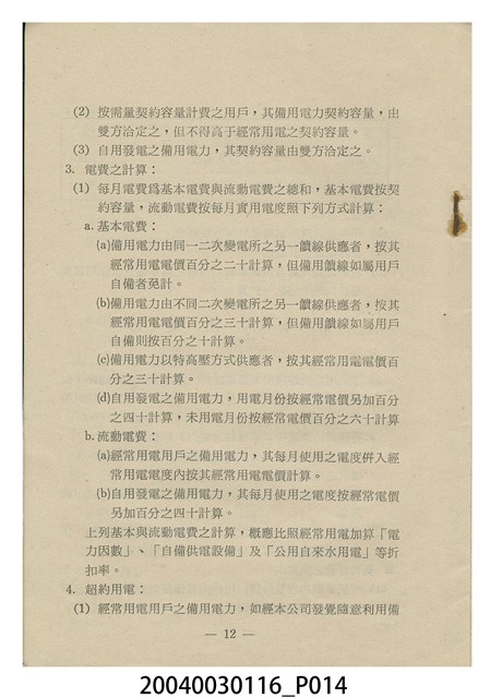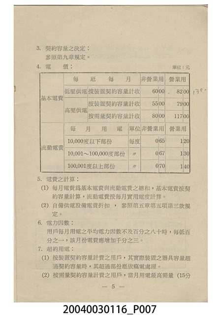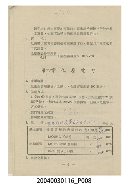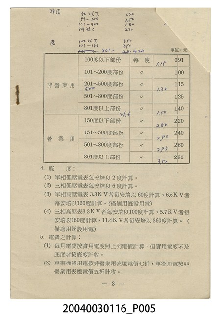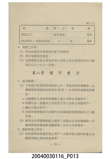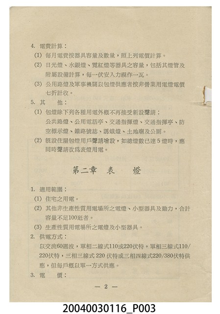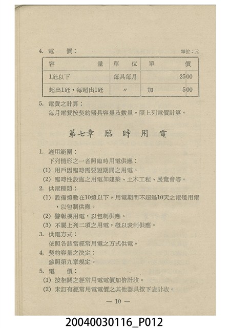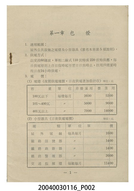 本物件為台灣電力公司電價表,書皮為米白色紙皮,封面印著「灣電力公司電價表 中華民國六十三年元月二十七日起實施 經濟部經(六三)國營04682號函准予備查」,內容為包燈、表燈、綜合用電等相關用電規則價目等。