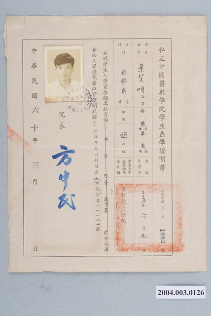 本文物為民國60年3月,由中國醫藥學院所開立之「學生在學證明書」:學生姓名為「葉賢明」、 籍貫「台灣省嘉義縣」、就讀於「藥學系五年級」。