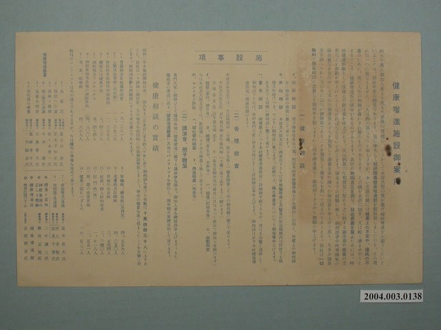 1.此物件為帝囯生命保險株式会社所發放的表單,正面印有帝囯生命保險株式会社的各店支部以及顧問名單,背面則印有關於此份健康增進施設的詳細內容。