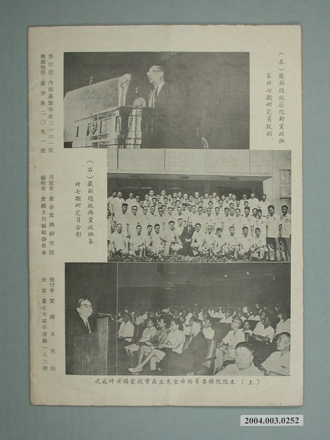 此為一紙質雜誌。此書為1967年(民國56年)7月20日,由實踐月刊編輯委員會編輯、實踐革命研究院出版的《實踐》第529期。 此物件提到的革命實踐研究院(以下簡稱為革實院),為國民黨政府來臺初期由中國國民黨總裁蔣中正於1949年10月16日所建立的國民黨黨政軍人才訓練所,研究院的地點設於草山(後稱陽明山)。革實院設立主因是國民黨敗退至臺灣,蔣中正認為必須從頭改革黨政軍,為日後「反攻大陸」奠定基礎,是故創立革實院以訓練人才。最初蔣中正曾將革實院命名為「革命雪恥學院」,後才改為「革命實踐研究院」之名(黃淑芬。2006。32-36)。 革實院於1953年於臺北木柵成立分院,1959年本分院合併於木柵,而原址改為國防研究院使用,1975年遷回陽明山,2000年因國民黨下野後的黨改造案,因此改名為國家發展研究院(黃淑芬。2006。37-42),但於2017年恢復革命實踐研究院之舊稱。
