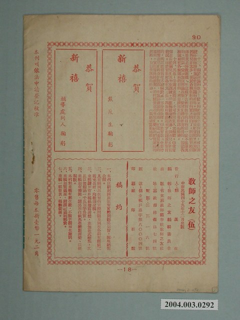 1.本文物為民國49年12月出版的 《教師之友》雜誌第5期。 2.本刊創刊號於民國49年4月1日,由臺灣省立嘉義師範學院教師之友社出版,原定為一年5期:二、四、六、十、十二月出刊;自第51卷第1期(民99年4月)起改為發行一年3期;本刊發行至第51卷第3期(民99年12月)止;自民100年6月起改刊名為:《教師專業研究期刊》,期數另起。