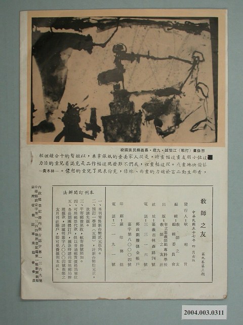 1.本文物為民國57年4月出版的 《教師之友》雜誌第9卷第3期。 2.本刊創刊號於民國49年4月1日,由臺灣省立嘉義師範學院教師之友社出版,原定為一年5期:二、四、六、十、十二月出刊;自第51卷第1期(民99年4月)起改為發行一年3期;本刊發行至第51卷第3期(民99年12月)止;自民100年6月起改刊名為:《教師專業研究期刊》,期數另起。