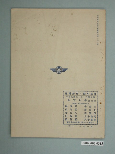 "本文物為教育部審定高級中學適用《音樂》課本第四冊,民國51年1月臺七版,大中書局印行。封面有「陳茂裕印」章。 "