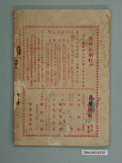 本文物為民國51年元月《升學月刊》雜誌第 2卷第5期。此雜誌是嘉義學生良友社出版,發行人為何錦華,作為投考高中‧高職‧師範入學指導。