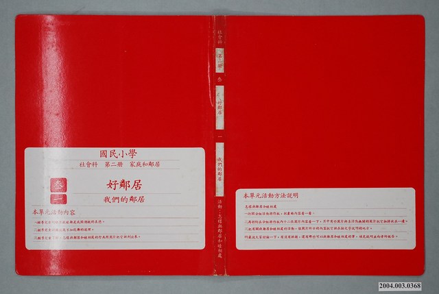 本文物為教具圖卡,紙本、彩色印刷,正面插畫描繪幾個人物在坐在房屋前的樹下喝茶聊天,「想想看,把睦鄰適當的圖片,排在以下空格裡」:下方有活動的8張牌卡,分別有接到照顧小孩、喜慶祝賀、守望相助...等。背面紅色單色印刷,印有文字:「社會科第二冊家庭和鄰居,叁鄰居、一我們的鄰居。本單元活動內容:一、輔導兒童明瞭敦親睦鄰是我國傳統的美德,二、輔導兒童認識遠親不如近鄰的道理,三、輔導兒童了解,怎樣與鄰居和睦相處的行為,用圖片排出來」。「本單元活動方法說明:怎樣與鄰居和睦相處,一、打開分組操作版,把內容看一看。二、再