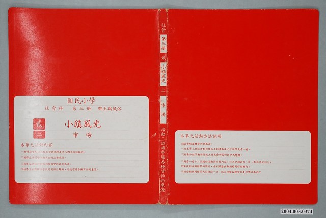 本文物為教具圖卡,紙本、彩色印刷,有「家庭、市場」文字「認識市場各種貨物的來源」「魚肉類攤位、蔬菜類攤位、水果類攤位、其他」,左下角有住家圖樣,內有穿衣、吃飯的圖片,中間有菜市場攤販圖片,右有養鴨、曬鹽、種果樹...等圓形圖卡。背面紅色單色印刷,印有文字:「社會第三冊貳小鎮風光二市場,本單元活動內容:一、輔導兒童知道人類衣食的來源是靠人們互相依賴的,二、輔導兒童知道人類衣食的主要來源,三、輔導兒童能從食物的歸類中認識其來源,四、輔導兒童用聯菁學教用具操作歸類,認識市場各種貨物的來源。」。「本單元活動方法說明,認識市場各種貨物的來源,一、打開分組操作版,把內容看一看。二、看看分組活動操作板上將衣食所需的計分為幾類。三、再看一看十二張圓形活動圖片的內容,將其分為肉、菜、果和其他四類。四、最後將分類結果的圖片,分別填壓在每類的圖形凹槽內。五、將分類結果大家討論一下,說出市場各種貨物是從哪裡來的?」