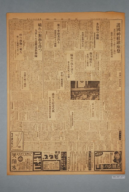 此物件為1942年4月19日出版的《夕刊興南新聞》第4038號,物件篇幅為單面,共計1版(第2版)物件內容要目計有:〈パナイ島三州の首都完全に皇軍の治下へ〉、〈カピス市を完全占領、陸鷲パ島上空に殺到、イロイロ市完全占領わが軍の損害は皆無〉、〈總選舉戰の鳥瞰圖(下)推薦制波紋の戰局〉、〈緬甸英軍の非人道又も白日下に暴露〉、〈護國神社鎮座祭五月廿三日から嚴かに執行遺族を招き感激の社頭對面〉、〈晴れの對面を待つ入京した臺灣遺族部隊〉等。 興南新聞社,前身為臺灣新民報社,為日治時期臺灣人創刊的重要報紙之一。在前身《臺灣民報》時期,便自詡為「臺灣人唯一的言論機關」,在當時的政治運動脈絡裡有重要地位。後在1930年,《臺灣民報》更名為《臺灣新民報》,並於1932年改為日刊發售。1941年,在日本帝國發動南向政策的時局下,《臺灣新民報》改名為《興南新聞》,同時批判政府的言論趨緩。之後,《興南新聞》與其他5份報刊在1944年被臺灣總督府整併為《臺灣新報》。 日治時期的報紙刊行十分困難。日本政府於1883年 發表「新聞紙條例」,對國內報章出版以「許可制」、「保證金」加以規範,「新聞紙條例」大幅限制報章出版,使得64家報刊被迫停辦,是以被日本史家稱為「新聞撲滅法」。而在日治時期臺灣,在殖民地統治專法《六三法》中此條例被沿用,限制臺灣創報。無法負荷的保證金、許可制的箝制、禁刊事項的不清楚、警察的干涉等種種,都使臺人辦報十分困難。到了1937年,在戰爭時期新聞管制之下辦報更加困難(王天濱,2002。78-86)。