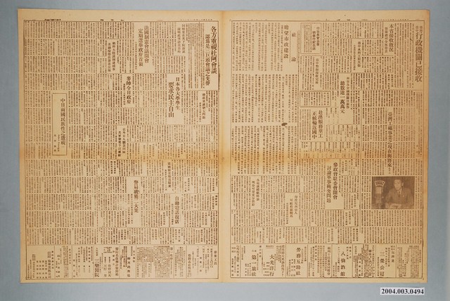 此為一紙質報紙,以黑色字體印刷,本物件為1945年(民國34年)11月11日發行之《臺灣新生報》第18號,此物件為單張雙面,共四版,內容計有〈臺灣行政長官公署通告:署人字第74號〉(行政長官陳儀)、〈臺灣行政長官公署通告:署財字第一○九號〉(行政長官陳儀)、〈臺灣行政長官公署通告:署秘字第139號〉(行政長官陳儀)、〈通告〉(兼市長黃朝琴)、〈臺南、臺中行政機關已接收〉、〈本省接收概況 警備總司令部發表〉、〈行政長官公署明舉行紀念週〉、〈臺中水利工程失修,公署即派工程專家前往調查〉、〈臺中警察接收完竣〉、〈臺灣工礦事業之現在與將來〉(包可永)、〈本市各金融機關日銀卷總數達一萬萬元〉、〈赴澳服務華工正候輪返國中〉、〈參政會駐委會開會討論軍事衝突問題〉、〈印度尼西亞人可組荷蘭聯邦 荷印提議召開圓枱會議〉、〈各項液體燃料油,明春可望充分供給〉、〈社論:瞻望市政建設〉、〈各方重視杜阿會談,認為是三巨頭會議之先聲〉、〈阿特里在英下院演說,說明此次訪美目的〉、〈法國制憲會議開會,定期選舉政府首領――社會黨首領古恩當選眾院院長〉、〈納粹大陰謀團逮捕事 美總檢察長發表公報〉、〈摩根索談猶太問題,謂應由美國負責解決〉、〈日本各大學學生要求自由民主〉、〈麥帥令日政府運蠶種十五萬張至韓國〉、〈在外日人匯款回國,美軍發覺予以凍結〉、〈德國糧食頗為隱憂,僅能供給全國人口之六成〉、〈自動電話復活,磁石式電話今日起廢止〉、〈警局破獲二大案〉、〈中日兩國民民族性之透視(下)〉(Hubert Freyn原著、葉明勳譯)、〈社論:市政建設に期待〉、〈あす國父の誕生日〉、〈石炭の增產を討議,炭業組合隘路の打開へ〉、〈日本戰犯容疑者二千 マ元帥,早意に裁判 せん〉、 〈臺中市行政機關の接收開始〉、〈甦へる省都(5)〉、〈軍事接收概況續報〉、〈在臺日本人の一步前進へ:破廉恥行為の清算〉(尾崎三郎)、〈自働電話に復活,けふから差當り千本〉、〈新建設に電波は躍動,明快なニュースに民眾吸込まる〉、〈全幅的協力を要望 接管委員會、州民代表々接見〉、〈寢食の用意も完備――韓國人の生活に萬全の措置〉、〈農民の認識を望む――趙農林處長の放送〉等。 《臺灣新生報》創刊於1945年10月,是戰後初期由臺灣省行政長官公署宣傳委員會所經營的官方報刊,其前身為1944年,臺灣總督府整併島內六間報社所發行的《臺灣新報》。《臺灣新生報》最初由李萬居主導,雖屬官營報紙,但仍忠實反應民意,在二二八事件前夕,官民衝突漸深之際,新生報屢次發表告誡官方約束權力之言論。二二八事件之後,李萬居職權遭架空,辦報人員亦多被肅清,《臺灣新生報》成為更加偏向政府的報紙。 中華民國政府於1945年接收臺灣之始,即派出「中央宣傳部」整頓臺灣報業,撤廢日治時期管控報紙的許可制度,改為登記申請制,管制的解除使得戰後初期的辦報風氣大盛。後由於民間報刊對於接收後的行政長官公署多有批判,於是在二二八事件之後,政府開始嚴格控管報紙,在戒嚴開始後更以資源節約、端正文化等理由施行「報禁」。(王天濱,2002。154-170)