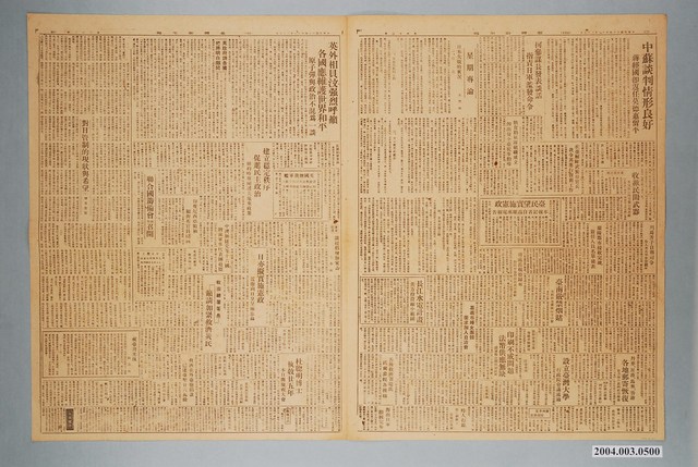 此為一紙質報紙,以黑色字體印刷,本物件為1945年(民國34年)11月25日發行之《臺灣新生報》第32號,此物件為單張雙面,共四版,內容計有〈臺灣省行政長官工署通告:署宣字第○○六○號〉、〈臺灣省行政長官公署農林處通告:農糧秘芳字第三號〉(處長趙連芳)、〈臺灣省行政長官公署交通處公告:交鐵字第七號〉(代處長陳清文)、〈台北市政府通告:工建字第四十六號〉(兼市長黃朝琴)、〈中蘇談判情形良好,蔣經國即返任莫德惠留平〉、〈柯參謀長發表談話,指責日軍濫發命令〉、〈粮食勸征隊組織成立,即出發全臺從事勸導〉、〈在臺解除武裝日官兵,我令其進行復舊工作〉、〈黃市長談話:收繳民間武器,希望直接向市警局呈獻〉、〈臺民望實施憲政 本報記者自高雄來電報告〉、〈川島芳子自稱司令,伶人李萬春曾墮○中〉、〈蘭陽郡市接收完竣,新任人員名單發表〉、〈臺南嚴禁烟賭,未經核准團隊限令解散〉、〈周處長視察歸來,對民眾協助接收表示感慰〉、〈丹麥、星港、馬來、香港 各地郵寄恢復,航空函件應納航空郵費〉、〈設立臺灣大學 行政會議通過〉、〈印刷不成問題 法幣供應無缺 凌憲揚由滬返渝談話〉、〈嘉義市婦女團體要求加入自治會〉、〈星期專論:日本失敗的實況〉(宋斐如)、〈長江水電計畫 美方投資縮小範圍〉、〈嘉義市婦女團體要求加入自治會〉、〈善後救濟署瑞氏抵蘭參觀各機構〉、〈海南日軍繳械完畢〉、〈英外相貝汶強烈呼籲:各國應維護世界和平,原子彈與政治不混為一談〉、〈英政府請各國把牌明白攤開〉、〈建立穩定秩序 促進民主政治 紐約時報闡述美遠東政策〉、〈聯合國籌備會改期召開〉、〈印度尼西亞領袖願與英官員磋商〉、〈中澳加捷克等十六國將派軍事代表團赴德〉、〈日亦擬實施憲政,近衛向日皇呈備忘錄〉、〈救濟總署署長籲請加緊救濟災民〉、〈救濟在外臺包捐款已達臺必廿六萬餘〉、〈讀者投書:請提倡增加家畜〉(王金桂)、〈杜聰明博士執教廿五年 本日開慶祝大會〉、〈對日管制的現狀與希望(下)〉(鹽見聖策)、〈祝臺灣光復〉(陳若時)、〈日曜評論:日本失敗の實況〉(宋斐如)、〈三民主義に立腳し 糖業の再編成へ 蔗農の私案,政府に建議〉、〈在日臺胞送還に關する 日側宣傳は虛構――柯參謀長,談話で指摘〉、〈內戰に干涉せす ソ聯の對中國動向〉、〈海南島の武裝解除終る〉、〈復舊工作に日軍使用 準備終り次第即刻開始〉、〈戰慄すべき未來戰 原子兵器は文明の大運行 〉、〈新政府めぐり:國民黨省黨部の卷〉、〈在外臺胞救濟義捐金〉、〈全日本人各位へ〉、〈牛の屠殺を禁す,違反者は假借なく嚴罰〉、〈米買上げに萬全 調整委員會で 割當量決まる〉、〈建築は許可を要す 臺北市取締暫行辦法公布〉、〈佛國と協調 各國との問題にも善處〉等。 《臺灣新生報》創刊於1945年10月,是戰後初期由臺灣省行政長官公署宣傳委員會所經營的官方報刊,其前身為1944年,臺灣總督府整併島內六間報社所發行的《臺灣新報》。《臺灣新生報》最初由李萬居主導,雖屬官營報紙,但仍忠實反應民意,在二二八事件前夕,官民衝突漸深之際,新生報屢次發表告誡官方約束權力之言論。二二八事件之後,李萬居職權遭架空,辦報人員亦多被肅清,《臺灣新生報》成為更加偏向政府的報紙。 中華民國政府於1945年接收臺灣之始,即派出「中央宣傳部」整頓臺灣報業,撤廢日治時期管控報紙的許可制度,改為登記申請制,管制的解除使得戰後初期的辦報風氣大盛。後由於民間報刊對於接收後的行政長官公署多有批判,於是在二二八事件之後,政府開始嚴格控管報紙,在戒嚴開始後更以資源節約、端正文化等理由施行「報禁」。(王天濱,2002。154-170)