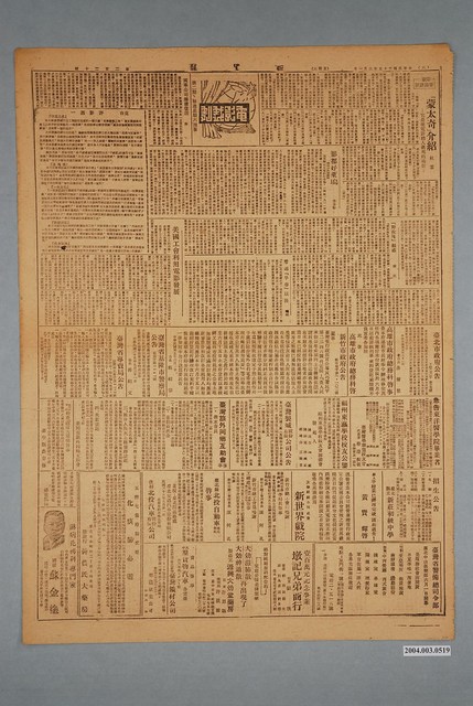 此為一紙質報紙,以黑色字體印刷,本物件為1946年(民國35年)6月1日發行之《臺灣新生報》第220號,此物件採雙面印刷,共計五版,此處為其第五版,以及《電影戲劇》第2期。內容計有〈青年軍一百零三名 六月八日復員回省 民政處積極辦理工作〉、〈海南臺胞歸心似箭 賣衣買米日食為難 盼望政府設法迎接〉、〈本市公共事業概況 廖處長對記者發表談話〉、〈省體育局本日成立 廣播電臺舉行實況播送〉、〈中山俱樂部 本日舉行開幕禮〉、〈澎湖教員日啖兩餐 學生缺食面黃肌瘦 鄭視察談視察情形〉、〈臺北市警察局 設置意見箱 市民得自由陳述隱情〉、〈本省戶口清查工作 六月底可全部完竣〉、〈物價飛漲購買力薄 滬閩商家多虧本而返〉、〈臺灣海員工會成立 聘李主任等五人為顧問〉、〈協助維持社會治安 收容一般失業遊民 警備總部勞動訓導營概況〉、〈影劇常識講話:「蒙太奇」介紹——它是使電影踏入藝苑的功臣〉(杜雲)、〈影都好萊塢〉(李杏邨∕譯自合眾國雜誌)、〈「野玫瑰」觀感〉(塘江)、〈看過「早春」以後〉、〈美國工會利用電影發展〉、〈國華公司籌備復活〉(萍)、〈一週影評〉(白克)。 《臺灣新生報》創刊於1945年10月,是戰後初期由臺灣省行政長官公署宣傳委員會所經營的官方報刊,其前身為1944年,臺灣總督府整併島內六間報社所發行的《臺灣新報》。《臺灣新生報》最初由李萬居主導,雖屬官營報紙,但仍忠實反應民意,在二二八事件前夕,官民衝突漸深之際,新生報屢次發表告誡官方約束權力之言論。二二八事件之後,李萬居職權遭架空,辦報人員亦多被肅清,《臺灣新生報》成為更加偏向政府的報紙。 中華民國政府於1945年接收臺灣之始,即派出「中央宣傳部」整頓臺灣報業,撤廢日治時期管控報紙的許可制度,改為登記申請制,管制的解除使得戰後初期的辦報風氣大盛。後由於民間報刊對於接收後的行政長官公署多有批判,於是在二二八事件之後,政府開始嚴格控管報紙,在戒嚴開始後更以資源節約、端正文化等理由施行「報禁」。(王天濱,2002。154-170)
