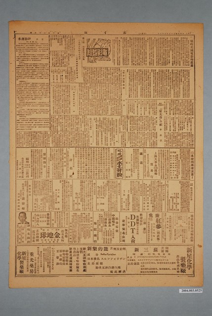 此為一紙質報紙,以黑色字體印刷,本物件為1946年(民國35年)6月8日發行之《臺灣新生報》第227號,此物件採雙面印刷,共計五版,此處為其第五版,以及《電影戲劇》第3期。內容計有〈何應欽上將昨飛抵台 擬逗留數天參觀本省 今日赴基隆明晨飛屏東〉、〈何上將略歷〉、〈川康國大代表團抵臺〉、〈到處貧民無米可吃 酒家菜館返見日增 省垣所見明暗兩世相〉、〈本省新聞室業現況 雜誌報紙總計五十九家〉、〈臺灣教育的來龍去脉――貢獻於行將開幕的省教育行政會議〉(楊乃)、〈戰時美國電影的進展〉、〈一九四五年的十大名片――「威爾遜總統傳」膺首選〉、〈「惜分飛」觀後感〉(茵露)、〈「蒙太奇」介紹(四)〉(杜雲)、〈韓蘭根鎮江演唱〉、〈評「女子公寓」〉(沈汀)、〈本週影評〉(白克)等。 《臺灣新生報》創刊於1945年10月,是戰後初期由臺灣省行政長官公署宣傳委員會所經營的官方報刊,其前身為1944年,臺灣總督府整併島內六間報社所發行的《臺灣新報》。《臺灣新生報》最初由李萬居主導,雖屬官營報紙,但仍忠實反應民意,在二二八事件前夕,官民衝突漸深之際,新生報屢次發表告誡官方約束權力之言論。二二八事件之後,李萬居職權遭架空,辦報人員亦多被肅清,《臺灣新生報》成為更加偏向政府的報紙。 中華民國政府於1945年接收臺灣之始,即派出「中央宣傳部」整頓臺灣報業,撤廢日治時期管控報紙的許可制度,改為登記申請制,管制的解除使得戰後初期的辦報風氣大盛。後由於民間報刊對於接收後的行政長官公署多有批判,於是在二二八事件之後,政府開始嚴格控管報紙,在戒嚴開始後更以資源節約、端正文化等理由施行「報禁」。(王天濱,2002。154-170)
