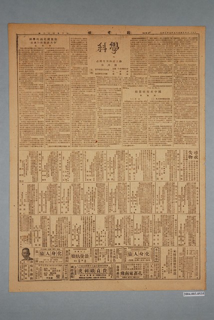 此為一紙質報紙,以黑色字體印刷,本物件為1946年(民國35年)6月13日發行之《臺灣新生報》第232號,此物件採雙面印刷,共計五版,此處為其第五版,以及《科學》第4期。內容計有〈何上將昨離臺飛榕 各界均到機場歡送 臨別贈言 望參議會與政府合作〉、〈本省救署呼籲收效 大批肥料抵臺 經派專車到高雄候接〉、〈切實推行省垣衛生 希望市民自動協力 市衛生院長提示三點〉、〈省農林處續開蔗糖討論大會 決案將呈長官核批〉、〈善救分署救濟工作 本省著重五點推行 錢署長報告最近情形〉、〈科學的返老還童法〉(法國 S•伏龍諾夫∕白石譯)、〈地質研究在中國〉(林熙章)等。 《臺灣新生報》創刊於1945年10月,是戰後初期由臺灣省行政長官公署宣傳委員會所經營的官方報刊,其前身為1944年,臺灣總督府整併島內六間報社所發行的《臺灣新報》。《臺灣新生報》最初由李萬居主導,雖屬官營報紙,但仍忠實反應民意,在二二八事件前夕,官民衝突漸深之際,新生報屢次發表告誡官方約束權力之言論。二二八事件之後,李萬居職權遭架空,辦報人員亦多被肅清,《臺灣新生報》成為更加偏向政府的報紙。 中華民國政府於1945年接收臺灣之始,即派出「中央宣傳部」整頓臺灣報業,撤廢日治時期管控報紙的許可制度,改為登記申請制,管制的解除使得戰後初期的辦報風氣大盛。後由於民間報刊對於接收後的行政長官公署多有批判,於是在二二八事件之後,政府開始嚴格控管報紙,在戒嚴開始後更以資源節約、端正文化等理由施行「報禁」。(王天濱,2002。154-170)