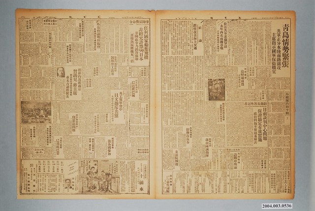 此為一紙質報紙,以黑色字體印刷,本物件為1946年(民國35年)6月14日發行之《臺灣新生報》第233號,此物件採雙面印刷,共計五版,此處為其第一至四版,內容計有〈交通部臺灣省郵電管理局公告:第一○號〉(局長陳一壽)、〈臺灣省交通處鐵路管理委員會工程招標公告〉、〈臺北土地處理處公告〉(處長江厚祥)、〈中華海員工會臺灣分會公告〉(理事長吳國信)、〈善後救濟總署臺灣分署招搞英文打字員中文書記公告:署字第一三二九號〉(署長謝宗起)、〈臺灣省鐵路警察署公告招領〉、〈臺灣省臺灣拓植株式會社接收委員會招調林業技術人員啟事〉(主任委員葛敬恩、副主任委員張延哲、委員馬咸)、〈臺北市政府公用事業管理處為換發汽車牌照及駕駛人際工執照事公告〉(處長廖文毅)、〈青島情勢緊張 共軍正分水陸兩路圍攻 主席指示國軍保衛機宜〉、〈拉法共軍進竄擊潰 永年西北兩關巷戰 山西絳縣城郊正激戰中〉、〈京市各界 追悼戴雨農 主席親臨主祭〉、〈馬歇爾的和平觀(下)信念在消逝中〉、〈彭部長答外記者 目前談判中心問題 保證協定有效實施 政治問題不難迎刃解決〉、〈海軍史上創舉 我國艦隊訪問訪問珍珠港 大批美艦明年移交我國〉、〈白魯德將軍即將返長春 瀋長間鐵路將修復〉、〈在華日俘改由陳誠指揮 粵日戰犯被判死刑〉、〈立法院例會 通過組織財政商聯合會〉、〈社論:趕快改善海上交通〉、〈麥帥頒佈命令 任何國家船隻飛機 非經允許禁入日本 麥帥此乃針對蘇聯 日捕魚區將擴充一倍〉、〈外長會議明日復會 貝爾納斯今乘機飛巴黎〉、〈英新任駐華大使 史蒂文森將來華 蔣主席餞送薛穆大使〉、〈杜魯門總統逼批駁 凱斯勞工法案 並提出具有建設性之標準〉、〈坦其隆調查團 已返抵巴城 美洲僑領電呈蔣主席 請向荷印政府嚴重交涉〉、〈英工黨年會中 貝文指斥共黨 英願與蘇修睦但不訴諸武力〉、〈顧維鈞返抵南京 曾謁見蔣主席 顧氏對記者談美蘇關係 並未否認將使美〉、〈美方加速解決 印憲法問題 印國大執會已復會〉、〈經社理事會 邀各國參加 下週舉行會議,西國除外〉、〈越南代表團已飛抵巴黎 法越談判開始舉行〉、〈美將購買國外地產 充作外交領事宿舍〉、〈落奇少將小史〉、〈社論:速かに海上交通を改善せよ〉、〈共黨の協定旅行 諸問題解決の鍵 外記者招待會 •彭部長談〉、〈山東方面の戰況〉、〈不良警官の檢舉 里民會の協力望む 臺北市臨時餐議會游市長言明す〉、〈黃市長に捺印強要 前統計股長短鎗持つて公室に闖入〉、〈六一七は本省屈辱日 基隆市で民族精神昂揚紀念〉、〈體育會不詳事件契機に 教育の刷新を要求 臺大先修班の聲明〉、〈臺南市糧食調劑委員會に またも不正事件 參議會調查に出す〉、〈臺灣視察後の感想 何應欽上將の放送全文(下)〉等。 《臺灣新生報》創刊於1945年10月,是戰後初期由臺灣省行政長官公署宣傳委員會所經營的官方報刊,其前身為1944年,臺灣總督府整併島內六間報社所發行的《臺灣新報》。《臺灣新生報》最初由李萬居主導,雖屬官營報紙,但仍忠實反應民意,在二二八事件前夕,官民衝突漸深之際,新生報屢次發表告誡官方約束權力之言論。二二八事件之後,李萬居職權遭架空,辦報人員亦多被肅清,《臺灣新生報》成為更加偏向政府的報紙。 中華民國政府於1945年接收臺灣之始,即派出「中央宣傳部」整頓臺灣報業,撤廢日治時期管控報紙的許可制度,改為登記申請制,管制的解除使得戰後初期的辦報風氣大盛。後由於民間報刊對於接收後的行政長官公署多有批判,於是在二二八事件之後,政府開始嚴格控管報紙,在戒嚴開始後更以資源節約、端正文化等理由施行「報禁」。(王天濱,2002。154-170)