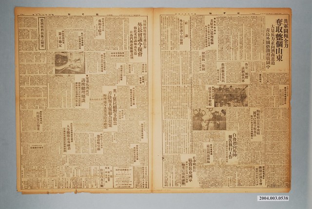 此為一紙質報紙,以黑色字體印刷,本物件為1946年(民國35年)6月15日發行之《臺灣新生報》第234號,此物件採雙面印刷,共計五版,此處為其第一至四版,內容計有〈臺灣省行政長官公署令〉(行政長官陳儀)、〈交通部臺灣郵電管理局公告:第一○號〉(局長陳壽年)、〈交通部臺灣郵電管理局工程招標公告:第十一號〉(局長陳壽年)、〈善後救濟總署臺灣分署招搞英文打字員中文書記公告:署字第一三二九號〉(署長謝宗起)、〈臺灣省鐵路警察署公告招領〉、〈臺灣省臺灣拓植株式會社接收委員會招調林業技術人員啟事〉(主任委員葛敬恩、副主任委員張延哲、委員馬咸)、〈臺灣省行政長官公署資源委員會臺灣機械造船股份有限公司公告〉(總經理高禩瑾)、〈共軍圖傾全力 奪取整個山東 大量兵力正向濟南進迫 青島外圍仍激烈戰鬪中〉、〈青島危急聲中 美駐軍已積極戒備 海軍首腦每日舉行會議 柯克飛京曾與馬帥會商〉、〈財部統一幣制 正研究適當辦法〉、〈魯廿二團體請制裁共軍〉、〈救濟蘇北災民 各部長在鎮召開會議 擬定八項辦法〉、〈我海軍訓練團接收美軍贈艦 美籍專家助我訓練海軍〉、〈全國天主教友們應該竭誠擁護中央 在主席領導下建設新中國 樞機主教田耕莘在京廣播〉、〈陶賴昭被共軍攻陷 國軍已退守松花江 梅河口突遭共軍飛機轟炸〉、〈白魯德向馬帥報告執行工作並與國共代表團交換意見〉、〈參政會提議嚴懲周逆佛海 並請宋院長出席報告〉、〈經部延攬專家 將開計畫委會 蕭錚次長對記者談〉、〈杜聿明長官 犒賞長春國軍 梁華盛主席飛永吉履新 鮑萊已飛抵瀋陽〉、〈社論:外長會議今日復會〉、〈貝爾納斯離美飛巴黎 外長會議今復會 傳今次會議如再失敗 渡魯門將赴蘇聯談判〉、〈貝氏希望人民 為和平禱告 外長會議任何進展 並非一國外交勝利〉、〈德境美蘇佔領區 舉行貿易會議 討論溝通商業〉、〈伊政府與亞省簽立協定 亞省放棄自治地位〉、〈麥帥指令日本 由華運入麥麩〉、〈安伯托已離開羅馬 表示並不放棄特權〉、〈英工黨以絕對多數票 否決與共黨聯合提案 摩理遜斥共黨為陰謀政黨〉、〈蒙哥馬利抵埃訪埃總理晤談 胡西尼大主教離法返中東 將恢復活動煽動回教人民〉、〈遠東委會與盟軍總部 人事關系甚為融洽 日海空交通規定嚴格管制〉、〈越南各地僑胞均能安居樂業 袁子健對記者談僑務〉、〈德國燃料技術之秘密〉、〈社論:外相會議本日再會〉、〈各地の綜合戰況發表 國防部中共の協定違反を指摘〉、〈市區擴大と 臺中港の完成へ 市民大會で討論せん 〉、〈無收穫は免稅 新竹縣政府で調查表を作製〉、〈待望のビール 七月頃にお目見得〉、〈臺中一中 操觚界の援助切望 魁けて記者を招待〉、〈新竹市の總豫算 四千六百餘萬元を計上〉、〈陳長官,本社を視察〉、〈毆打事件真相〉、〈阿片事件の波紋 新事實で更に展開〉、〈臺南工專の球技比賽 若人の潑刺さを發揮〉、〈德田曰く“とても食へぬ”饑飢日本の盛宴に一矢 日本首相官邸で皮肉な一幕劇〉等。 《臺灣新生報》創刊於1945年10月,是戰後初期由臺灣省行政長官公署宣傳委員會所經營的官方報刊,其前身為1944年,臺灣總督府整併島內六間報社所發行的《臺灣新報》。《臺灣新生報》最初由李萬居主導,雖屬官營報紙,但仍忠實反應民意,在二二八事件前夕,官民衝突漸深之際,新生報屢次發表告誡官方約束權力之言論。二二八事件之後,李萬居職權遭架空,辦報人員亦多被肅清,《臺灣新生報》成為更加偏向政府的報紙。 中華民國政府於1945年接收臺灣之始,即派出「中央宣傳部」整頓臺灣報業,撤廢日治時期管控報紙的許可制度,改為登記申請制,管制的解除使得戰後初期的辦報風氣大盛。後由於民間報刊對於接收後的行政長官公署多有批判,於是在二二八事件之後,政府開始嚴格控管報紙,在戒嚴開始後更以資源節約、端正文化等理由施行「報禁」。(王天濱,2002。154-170)