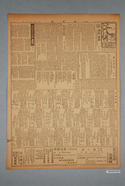 此為一紙質報紙,以黑色字體印刷,本物件為1946年(民國35年)6月17日發行之《臺灣新生報》第236號,此物件採雙面印刷,共計五版,此處為其第五版,以及《新地》第13期。內容計有〈本省五年經建計畫 經濟委員會編擬草案 經核定後明年初實行〉、〈中央軍官學校同學舉行校慶紀念大會 陳兼總司令親臨致訓詞〉、〈四川詩人與臺灣民主國 向川康國大代表表感謝〉(連震東)、〈致蔣校長電:臺灣省教育會 昨在中山堂舉行成立大會〉、〈建設民主的新文化 文化協進會昨舉行成立大會〉、〈新竹縣忠烈祠先烈 追加發表合祀十三名〉、〈國父廣州蒙難 二十四週年 省黨部舉行紀念會〉、〈關於霍亂防疫〉(王金茂)、〈耕耘•灌溉――我們建個臺灣新文化的苗圃〉(張望)、〈生活之道〉(美國 A•卞勒爾醫師譯作∕白石譯)、〈掃帚〉(孤帆)、〈萃唐漫筆(十二)明珠與鄭經往來函札(中)〉(耕農)、〈十四行詩〉(楊梅)、〈小人物沉浮錄〉(黎玄)等。 《臺灣新生報》創刊於1945年10月,是戰後初期由臺灣省行政長官公署宣傳委員會所經營的官方報刊,其前身為1944年,臺灣總督府整併島內六間報社所發行的《臺灣新報》。《臺灣新生報》最初由李萬居主導,雖屬官營報紙,但仍忠實反應民意,在二二八事件前夕,官民衝突漸深之際,新生報屢次發表告誡官方約束權力之言論。二二八事件之後,李萬居職權遭架空,辦報人員亦多被肅清,《臺灣新生報》成為更加偏向政府的報紙。 中華民國政府於1945年接收臺灣之始,即派出「中央宣傳部」整頓臺灣報業,撤廢日治時期管控報紙的許可制度,改為登記申請制,管制的解除使得戰後初期的辦報風氣大盛。後由於民間報刊對於接收後的行政長官公署多有批判,於是在二二八事件之後,政府開始嚴格控管報紙,在戒嚴開始後更以資源節約、端正文化等理由施行「報禁」。(王天濱,2002。154-170)