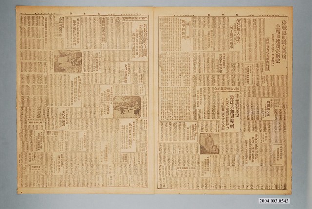 此為一紙質報紙,以黑色字體印刷,本物件為1946年(民國35年)6月18日發行之《臺灣新生報》第237號,此物件採雙面印刷,共計五版,此處為其第一至四版,內容計有〈臺灣省行政長官公署令〉(行政長官陳儀)、〈交通部臺灣郵電管理局工程招標公告:第十四號〉(局長陳壽年)、〈交通部臺灣郵電管理局公告:第十三號〉(局長陳壽年)、〈交通部臺灣郵電管理局公告:第十二號〉(局長陳壽年)、〈善後救濟總署臺灣分署招搞英文打字員中文書記公告:署字第一三二九號〉(署長謝宗起)、〈臺灣省交通處鐵路管理委員會工程招標公告〉、〈善後救濟總署臺灣分署公告:署字第一三五四號〉(署長謝宗起)、〈善後救濟總署臺灣分署公告:署字第一三五五號〉(署長謝宗起)、〈國營招商局臺北分局公告〉、〈臺灣省行政長官公署行政院資源委員會主辦臺灣紙業公司公告〉(總經理謝惠)、〈停戰限期瞬息將屆 主席盼速商定辦法 俾使三項提示全盤解決 政協各方代表續商時局〉、〈濟郊無大衝突 失陷城鎮守軍一部抵濟 娘子關仍有戰事〉、〈法遠東艦隊司令 晉謁主席致敬 青年軍鑄劍獻主席〉、〈華北巨奸 將開始公審 王蔭泰殷汝耕兩巨逆 已提起公訴〉、〈國父廣州蒙難紀念 主席訓勉屬僚 效法大無謂精神 只要不避艱險發奮努力 任何艱難困苦皆可克服〉、〈接收東北敵國物資 乃係中國應有權利 損失物資將由德日補償 鮑萊專員在瀋談賠償問題〉、〈軍校成立紀念 蔣校長訓詞 勗勉學生發揚固有光榮 益宏當前貢獻〉、〈社論:匯率與物價〉、〈巴黎天空陰晴靡定 外長會議昨午續開 討論對義合約問題 合約草案即可分發 義政府列最後議程〉、〈奧國問題亦列議程〉、〈杜魯門以自用飛機邀史達林赴每談判〉、〈中國境內日人 下月初可撤盡〉、〈十一國代表集巴黎 討論商業政策〉、〈打開印度政治僵局 延攬名流組新政府 魏督發請帖柬真納等均被邀〉、〈日主要戰犯廿六人 提出國際法庭受審〉、〈戴高樂放棄緘默作風 熱烈贊成兩院制 總統在政黨間有仲裁實權 法總統選舉戴氏最有希望〉、〈原子能委會開幕 美代表致詞 應擬定管制之全般計畫 憲章通過及須次第實行〉、〈美與埃及訂立航空運輸協定 美短期利用開羅機場 埃及蒐購美剩餘物資〉、〈四外長對義領土爭執的剖視〉(毛守豐)、〈社論:為替レートと物價 〉、〈原子力秘密の公開 米,委員會に歷史的建議〉、〈島民屈辱の日に 先烈の偉德を仰讚〉、〈忠烈祠の奉安典禮 新竹縣昨盛大に執行〉、〈藝閣•獅陣が總進軍 桃園終日空前の大賑ひ〉、〈敬老大會を開催 基隆市の屈辱紀念日〉〈參列遺族感激に咽ぶ〉、〈出入者を嚴重取締 臺南市のコレラ防遏強化〉、〈ベスト省都に侵入 全市民は武裝せよ 鼠軍を殲滅•注射忘るな〉、〈本省の前途は洋々 陳川康代表との一問一答〉、〈民間の十二倍“べらばうなハけレおやないか”日人家屋借用人の悲鳴〉、〈村里長の民選 本年後半期に實施〉、〈救援會、遺族を招待 劉縣長經過を語る〉、〈海南島臺胞の還送 沙班輪を利用の豫定〉、〈六月十七日の前後 忠烈祠典禮を紀念して(下)〉(楊逵)等。 《臺灣新生報》創刊於1945年10月,是戰後初期由臺灣省行政長官公署宣傳委員會所經營的官方報刊,其前身為1944年,臺灣總督府整併島內六間報社所發行的《臺灣新報》。《臺灣新生報》最初由李萬居主導,雖屬官營報紙,但仍忠實反應民意,在二二八事件前夕,官民衝突漸深之際,新生報屢次發表告誡官方約束權力之言論。二二八事件之後,李萬居職權遭架空,辦報人員亦多被肅清,《臺灣新生報》成為更加偏向政府的報紙。 中華民國政府於1945年接收臺灣之始,即派出「中央宣傳部」整頓臺灣報業,撤廢日治時期管控報紙的許可制度,改為登記申請制,管制的解除使得戰後初期的辦報風氣大盛。後由於民間報刊對於接收後的行政長官公署多有批判,於是在二二八事件之後,政府開始嚴格控管報紙,在戒嚴開始後更以資源節約、端正文化等理由施行「報禁」。(王天濱,2002。154-170)