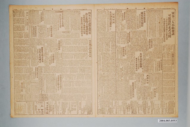 此為一紙質報紙,以黑色字體印刷,本物件為1946年(民國35年)6月23日發行之《臺灣新生報》第242號,此物件為單張雙面,共四版,內容計有〈軍事三人小組會議可能於昨正式召開,三方代表認為和平尚有希望,軍調部代表團飛哈會晤林彪〉、〈中共所提建議純屬洞空題目,政府決先實施緊急問題,中宣部發言人發表談話〉、〈重建軍事學校地點業已確定〉、〈青年團中央團部籌辦夏令營在南京北平區山三處受訓〉、〈資委會邀請美專家助我擬訂工礦計劃〉、〈美第七艦隊總部即將駐青島,美軍祝賀柯克服務四十年〉、〈星期專論:北省物價問題芻議〉、〈輾動中的基隆(上)〉(本報記者 菱舟)、〈湘災臨最嚴重時期必須加強救濟工作〉、〈共軍攻陷絳縣,永年國軍堅守南北兩關,東北交通遭破壞〉、〈飛機失事墮落鎮江近郊,飛行員已殞命〉、〈參政會請政府撤銷外輪航行內河並決定參加清查團人選〉、〈要求統一反對內戰,滬市學生示威遊行〉、〈四外長討論對義問題,決心衝毀不協調障壁,美提延期討論義殖民地,獲蘇賛同已組委會研究〉、〈美建議中英各國共佔日本廿五年,草案送交麥帥,中英已贊同〉、〈法越衝突加劇,戰事延及華僑區〉、〈美提議原子能計劃有成立協議可能〉、〈美派代表赴莫斯科討論增進美蘇貿易〉、〈印度獨立問題與中國〉(章熙林)、〈救濟猶太難民,盟國獲協議〉、〈尼赫魯釋放,印臨時政府問題目前已轉趨黯淡〉、〈國際緊急糧食委會宣告正式成立,安德遜任主席會員十九單位〉、〈保衛世界安全和平,美將維持龐大軍力,下午軍費預算逾七十億美元〉、〈蘇軍移走韓北工業,優待持有武器日人,美籍韓人提出控訴〉、〈蘇聯各報撰文譴責戴高樂〉、〈物價問題芻議〉、〈停戰令卅日まで延期,政府誠意と忍讓を表明〉、〈安平港を再築港,三個年計畫の豫算計上〉、〈ペスト船の乘客自發的に診斷を受けよ〉、〈省都に脂粉の旋風,謝女史宅に押かけた女軍〉、〈礦業稅の六十%,基隆市財源に割當つ〉、〈東亞新秩序にメス,日本の宣傳政策を訊問〉、〈精米工場の移讓,各地の農民切實に關心〉、〈失學兒童に福音,高雄市夜間小學を計劃〉、等。 《臺灣新生報》創刊於1945年10月,是戰後初期由臺灣省行政長官公署宣傳委員會所經營的官方報刊,其前身為1944年,臺灣總督府整併島內六間報社所發行的《臺灣新報》。《臺灣新生報》最初由李萬居主導,雖屬官營報紙,但仍忠實反應民意,在二二八事件前夕,官民衝突漸深之際,新生報屢次發表告誡官方約束權力之言論。二二八事件之後,李萬居職權遭架空,辦報人員亦多被肅清,《臺灣新生報》成為更加偏向政府的報紙。 中華民國政府於1945年接收臺灣之始,即派出「中央宣傳部」整頓臺灣報業,撤廢日治時期管控報紙的許可制度,改為登記申請制,管制的解除使得戰後初期的辦報風氣大盛。後由於民間報刊對於接收後的行政長官公署多有批判,於是在二二八事件之後,政府開始嚴格控管報紙,在戒嚴開始後更以資源節約、端正文化等理由施行「報禁」。(王天濱,2002。154-170)