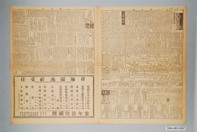 此為一紙質報紙,以黑色字體印刷,本物件為1947年(民國36年)1月13日發行之《臺灣新生報》第446號,此物件為單張雙面,共四版,內容計有〈憲法為國家根本大法,國民均應信仰與維護 總部紀念週方學李對官兵稱〉、〈新竹地方法院慶祝司法節,臺南司法保護分會成立〉、〈臺北縣治遷建,海山各界定期慶祝〉、〈臺東訂期召開中小校長會議,國校專科親導會開始工作〉、〈徐世大章錫綬等視察水利興築港〉、〈大甲區興修道路,經費預定百八十餘萬〉、〈臺北市財政局去年度稅收情形〉、〈臺中市營自來水將改進原有設備,水費近將調整酌予提高〉、〈再論解決土地問題〉(金惠)、〈臺南市職業介紹所招待記者報告工作〉、〈臺東鎮決組織糧食調解委會,擬請先予停發輸出證明書〉、〈臺東修築工程正從事進行〉、〈經濟動態管窺〉、〈霧〉(乙虹)、〈法國的水銀雜誌〉、〈仙公廟遊記〉、〈今天星期幾?〉、〈國防部第六廳招考電訊技術人員廣告〉、〈日產處理委員會臺北縣分會日人動產招標公告〉、〈行政長官公署交通處高雄港務局工程招標公告〉、〈臺灣省行政長官公署交通處鐵路管理委員會工程招標公告〉、〈財政部臺灣鹽務管理局臺南鹽業公司通告〉、〈善後救濟總署臺灣分署公告〉、〈臺灣省警察訓練所招生公告〉、〈臺灣銀行總行政招考銀行會計人員公告〉、〈臺灣省專賣局酒業有限公司〉、〈臺灣省專賣局臺北分局公告〉、〈臺灣省臺南縣政府公告〉等。 《臺灣新生報》創刊於1945年10月,是戰後初期由臺灣省行政長官公署宣傳委員會所經營的官方報刊,其前身為1944年,臺灣總督府整併島內六間報社所發行的《臺灣新報》。《臺灣新生報》最初由李萬居主導,雖屬官營報紙,但仍忠實反應民意,在二二八事件前夕,官民衝突漸深之際,新生報屢次發表告誡官方約束權力之言論。二二八事件之後,李萬居職權遭架空,辦報人員亦多被肅清,《臺灣新生報》成為更加偏向政府的報紙。 中華民國政府於1945年接收臺灣之始,即派出「中央宣傳部」整頓臺灣報業,撤廢日治時期管控報紙的許可制度,改為登記申請制,管制的解除使得戰後初期的辦報風氣大盛。後由於民間報刊對於接收後的行政長官公署多有批判,於是在二二八事件之後,政府開始嚴格控管報紙,在戒嚴開始後更以資源節約、端正文化等理由施行「報禁」。(王天濱,2002。154-170)