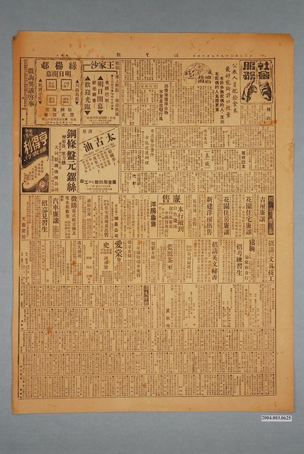 此為一紙質報紙,以黑色字體印刷,本物件為1949年(民國38年)9月14日發行之《臺灣新生報》第1408號,此物件為單張單面,共二版,內容計有〈農會底指導原則〉(柏森)、〈幾種普通磺氨類藥物對於獸醫上的貢獻〉、〈怎樣種植蔬菜(之二)〉(熾)、〈花旗橘子好吃麼〉(王炘)、〈新竹縣立中壢中學苗栗初中招生公告〉、〈臺灣省婦女工作委員會附設私立復興幼稚園續招新生〉、〈臺北市私立開南商工職業學校續招生公告〉、〈金甌女子商業職業學校招生〉、〈公教人員配給食米最好能夠計口授量,有許多無配偶的人,反比有配偶的人負擔更重〉、〈出借條借得公物不算是盜竊行為〉、〈日產審查案件希望能從速辦理〉等。 《臺灣新生報》創刊於1945年10月,是戰後初期由臺灣省行政長官公署宣傳委員會所經營的官方報刊,其前身為1944年,臺灣總督府整併島內六間報社所發行的《臺灣新報》。《臺灣新生報》最初由李萬居主導,雖屬官營報紙,但仍忠實反應民意,在二二八事件前夕,官民衝突漸深之際,新生報屢次發表告誡官方約束權力之言論。二二八事件之後,李萬居職權遭架空,辦報人員亦多被肅清,《臺灣新生報》成為更加偏向政府的報紙。 中華民國政府於1945年接收臺灣之始,即派出「中央宣傳部」整頓臺灣報業,撤廢日治時期管控報紙的許可制度,改為登記申請制,管制的解除使得戰後初期的辦報風氣大盛。後由於民間報刊對於接收後的行政長官公署多有批判,於是在二二八事件之後,政府開始嚴格控管報紙,在戒嚴開始後更以資源節約、端正文化等理由施行「報禁」。(王天濱,2002。154-170)