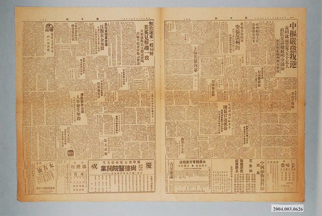 此為一紙質報紙,以黑色字體印刷,本物件為1949年(民國38年)9月15日發行之《臺灣新生報》第1409號,此物件為單張雙面,共四版,內容計有〈中樞嚴懲判逆黃紹竑龍雲等五十五人,政院呈請總統明令通緝,懲治叛亂條例將有修改〉、〈福州綏靖主任由湯恩伯接充〉、〈我強大海陸軍突襲溫州灣,登陸玉環島破壞匪工事,各地戰局無大變化〉、〈要員集成都紛謁蔣總裁,徐堪張羣均到達〉、〈襲臺颱風風力漸小,陸上警報今可解除〉、〈從顯微鏡下看北平醜劇〉、〈投匪無活路〉、〈上海共黨內幕(八)〉(傅紅蓼)、〈新界英軍趕建炮位,香港海面英艦演習〉、〈巡視閩海防務事畢,陳長官返抵臺,離廈後曾赴平潭島視察,昨與湯恩伯等商討防務〉、〈渝郊昨失火,化龍橋燬三百餘戶〉、〈對於遠東一般局勢,美英見解趨一致,艾契遜與貝文發表聲明,許曼今抵華府參加會談〉、〈美在貨幣基金會反對黃金加價,世銀行長布萊克驚人提議主張修改馬歇爾援歐計劃〉、〈大會領袖籲請歐洲將貨幣貶值〉、〈羅慕洛在美撰文闡述東南亞聯盟,自由國家須團結反共〉、〈伏希爾離日返美,臨別聲明此行頗多計劃,美高級貿易代表團抵日〉〈阿根廷在安理會控蘇施詭計,堅決反對十三國申請入會,蘇聯連續運用七次否決權〉、〈當前急待解決的一個問題〉﹙胡一貫﹚、〈三國財政會談公報原文(二)〉、〈四外交會議是否重開,蘇聯尚無意見表示,維辛斯基已申請赴美簽證〉、〈傳蘇聯政治局人事發生摩擦,伏茲尼森斯基等年老失寵,五新人被列入委員名單中〉、〈莫斯科派遣間諜赴美活動,前共黨份子在美參院供稱三神秘人士出席美共會議〉、〈狄托又挨罵,羅責南企圖侵略並暗助匈人反蘇〉、〈南北公路突告中斷,濁水溪吊橋傾折,中國航空公司卡車翻覆〉、〈彰化彰南彰西區召開區民代表會〉、〈玉山區各界召開置縣問題座談會,鹿谷鄉永興永豐兩村議請劃歸集集鎮管轄〉、〈新竹縣推行減租,鄒清之錄音報告〉、〈林淵嵩烈士之父移輓儀救濟災黎〉、〈陳燈煌暴斃大甲警所案,台中地檢處提公訴,兇手楊有等毆人致死證據確鑿,警所長呂訴上濫用職權〉、〈沙鹿鎮長嫁禍於人,壓迫鎮隊附自殺〉等。 《臺灣新生報》創刊於1945年10月,是戰後初期由臺灣省行政長官公署宣傳委員會所經營的官方報刊,其前身為1944年,臺灣總督府整併島內六間報社所發行的《臺灣新報》。《臺灣新生報》最初由李萬居主導,雖屬官營報紙,但仍忠實反應民意,在二二八事件前夕,官民衝突漸深之際,新生報屢次發表告誡官方約束權力之言論。二二八事件之後,李萬居職權遭架空,辦報人員亦多被肅清,《臺灣新生報》成為更加偏向政府的報紙。 中華民國政府於1945年接收臺灣之始,即派出「中央宣傳部」整頓臺灣報業,撤廢日治時期管控報紙的許可制度,改為登記申請制,管制的解除使得戰後初期的辦報風氣大盛。後由於民間報刊對於接收後的行政長官公署多有批判,於是在二二八事件之後,政府開始嚴格控管報紙,在戒嚴開始後更以資源節約、端正文化等理由施行「報禁」。(王天濱,2002。154-170)