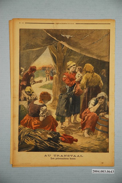 此物件為1901年1月20日發行的法文日報Le Petit Journal(小日報),此物件的其中一幅封面為八國聯軍在1900年攻佔河北保定府(現為河北省保定市一帶),並在1901年初對清朝廷要求賠償,而清廷也對促成八國聯軍的「義和團事變」相關人士處刑。另外一面為英國攻佔南非的「川瓦斯共和國」(Transvaal Republic)之後,在當地設立關押平民的集中營內的情形,之後英國便建立英屬川斯瓦殖民地。 Le Petit Journal(《小日報》)是一份法國報紙,發行於1863年,由來自法國波爾多地區的銀行家莫伊茨‧波利多‧米洛(Moïse Polydore Millaud)。《小日報》以價格低廉,內容通俗且刊載浪漫小說、人情味故事為特色,讀者眾多,成為世上第一份日銷超過百萬的報紙。《小日報》自1884年起增設每週副刊,以彩色石印版畫的形式紀錄世界重大事件。《小日報》的新聞插圖,以法國觀點對於1891至1911年間,關於中國近代化與對外開放的重大歷史時刻,提供了具體紀錄。 《小日報》為法國在19世紀末出現的「廉價報紙」之一,「廉價報紙」為法國當時的新型報紙之一,原有的報紙形態在經濟來源上依賴政府、政黨,並且內容上主要以政論文章為主,而「廉價報紙」則是以發行、廣告為其經濟收入來源,兩種報紙各有消費者,兩類型報紙在當時的法國並存,其中「廉價報紙」的代表為《小巴黎人報》、《小日報》