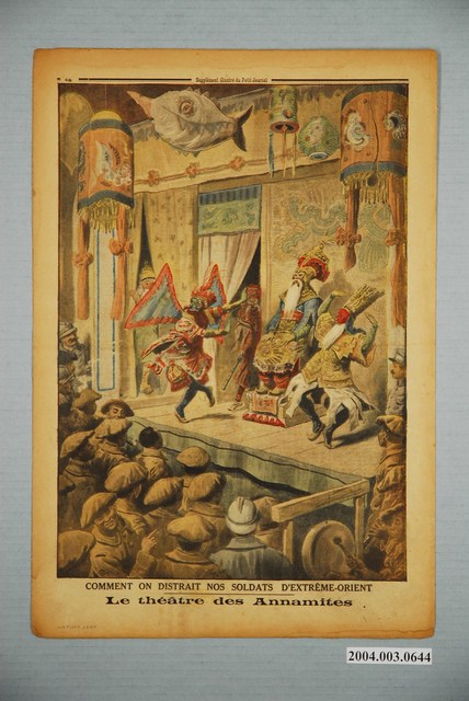 此物件為1917年2月11日發行的法文日報Le Petit Journal(小日報),此物件的其中一幅封面為一戰的將領馬利‧尤金‧德貝尼(Marie-Eugène Debeney),隸屬於法軍,並在1917年率領一支兵團參與索姆河戰役,此役雙方共產生130萬人的傷亡,以及第一場使用坦克的戰役,而後在1918年的各戰役中,馬利將軍以機動戰的戰術取得大量戰果。另外一個封面為法國在今越南中部建立的安南保護國中,在劇院中展演戲劇娛樂、慰勞士兵。 Le Petit Journal(《小日報》)是一份法國報紙,發行於1863年,由來自法國波爾多地區的銀行家莫伊茨‧波利多‧米洛(Moïse Polydore Millaud)。《小日報》以價格低廉,內容通俗且刊載浪漫小說、人情味故事為特色,讀者眾多,成為世上第一份日銷超過百萬的報紙。《小日報》自1884年起增設每週副刊,以彩色石印版畫的形式紀錄世界重大事件。《小日報》的新聞插圖,以法國觀點對於1891至1911年間,關於中國近代化與對外開放的重大歷史時刻,提供了具體紀錄。 《小日報》為法國在19世紀末出現的「廉價報紙」之一,「廉價報紙」為法國當時的新型報紙之一,原有的報紙形態在經濟來源上依賴政府、政黨,並且內容上主要以政論文章為主,而「廉價報紙」則是以發行、廣告為其經濟收入來源,兩種報紙各有消費者,兩類型報紙在當時的法國並存,其中「廉價報紙」的代表為《小巴黎人報》、《小日報》