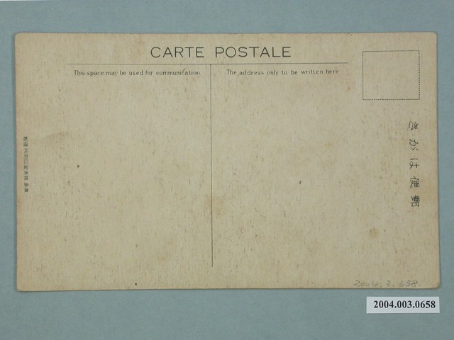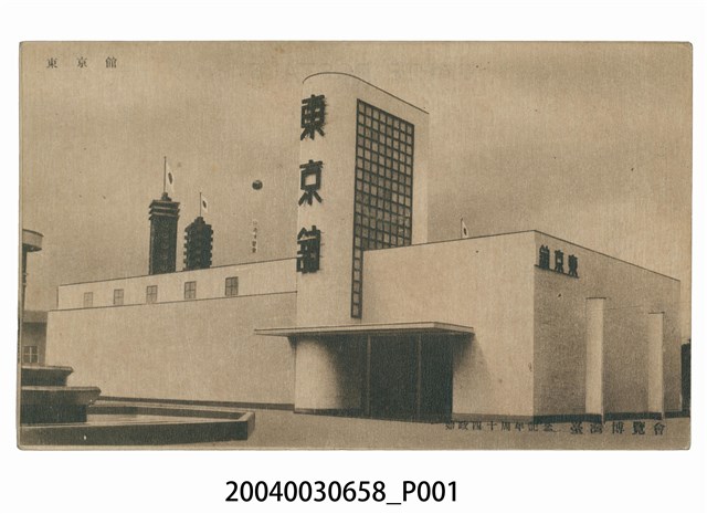 1.本物件為以始政四十周年記念臺灣博覽會,東京館為主題之明信片,正面為東京館黑白照片,畫面中可見其建物側面樣貌,主要建物上有「東京館」字樣,建物為白色,建築形式較為具有現代感,右下有1段文字「始政四十周年紀念臺灣博覽會」,左上有1段文字「東京館」;背面為空白明信片橫式書寫面,以黑色單色印刷,右上處為郵票黏貼處,右側有「郵便はがき」字樣,左側有「廣島精美堂印刷所謹製」字樣,上方有「CARTE POSTALE」及2行字樣,由左至右為「This space may be used for communication」、「The address only to be written here」。2.始政四十年紀念臺灣博覽會為西元1935年10月至11月以臺北為主舉辦的博覽會,分為4個會場,第一會場於臺北公會堂附近,第二會場於今二二八公園,第三會場於迪化街附近,第四會場於陽明山,而各地政府也各自舉辦小規模的展覽和活動。東京館位於第二會場內,為特設館,分為8個場面,主要為展示東京是境內的各石化工業、紡織業等現代化工業會社之營業狀況,不同於其他日本地方館,並沒有特產的展出與販賣。