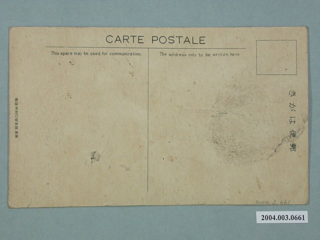 1.本物件為以始政四十周年記念臺灣博覽會,海女實演館為主題之明信片,正面為海女實演館黑白照片,畫面中可見其建物正面樣貌,建物上有1段文字「海女実演館」,建物倚1巨石建造,形似龍宮城建築,右上有1段文字「海女実演館」,左上有1段文字「始政四十周年紀念臺灣博覽會」;背面為空白明信片橫式書寫面,以黑色單色印刷,右上處為郵票黏貼處,右側有「郵便はがき」字樣,左側有「廣島精美堂印刷所謹製」字樣,上方有「CARTE POSTALE」及2行字樣,由左至右為「This space may be used for communication」、「The address only to be written here」。2.始政四十年紀念臺灣博覽會為西元1935年10月至11月以臺北為主舉辦的博覽會,目的為宣傳其統治的政績,及臺灣各項政策的成果,主要分為4個會場,第一會場位於臺北公會堂附近,第二會場於今二二八公園,第三會場於迪化街附近,第四會場於陽明山;此一期間各地政府亦有各自舉辦小規模展覽和活動。海女實演館位於第二會場,活動引進了當時日本新興娛樂型態,由一名海女在大型玻璃水槽內表演潛水、採集珍珠的工作實況。