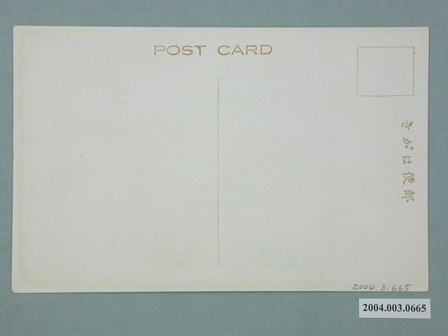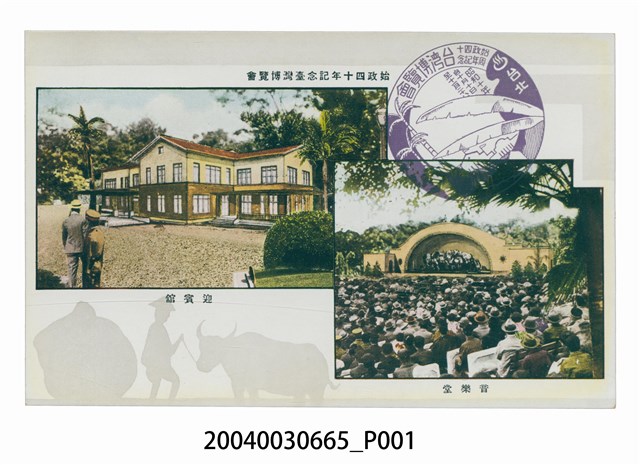 1.本物件為以始政四十周年記念臺灣博覽會,音樂堂與迎賓館為主題之明信片,正面為2張彩色圖像,右下圖像為音樂堂,畫面中可見為露天之音樂表演臺,臺下擠滿了觀眾,下方有1段文字「音樂堂」,左上圖像為迎賓館,畫面中可見其建物側面樣貌,為2層樓建築,給人幽密的感覺,下方有1段文字「迎賓館」,上方有1段文字「始政四十周年紀念臺灣博覽會」,右上有1藍色圓形戳印,印有椰子樹與香蕉樹之圖案,內有由外至內,由上至下「台北」、「始政四十周年記念台灣博覽會」、「昭和十年十月十日至十一月二十八」3段字樣;背面為空白明信片直式書寫面,以黑色單色印刷,左上處為郵票黏貼處,上方有「郵便はがき」字樣,左側有「POST CARD」字樣。2.始政四十年紀念臺灣博覽會為西元1935年10月至11月以臺北為主舉辦的博覽會,分為4個會場,臺北公會堂附近、二二八公園、迪化街附近、陽明山,各地政府也舉辦小規模的展覽和活動。迎賓館位於第二會場,為2層樓建築,主要為迎接國內外貴賓時的場所,其內的接待員皆為女性,須經過測試方可錄取。音樂堂位於第二會場,為一露天展演臺,其演奏樂團為細田管弦樂團,今日228公園內之音樂堂即是擴建後的產物。
