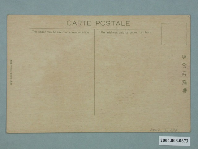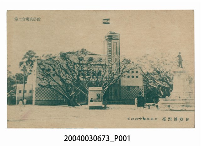 1.本物件為以始政四十周年記念臺灣博覽會,演藝館為主題之明信片,正面為演藝館黑白照片,畫面中可見其建物正面樣貌,建物前有2棵樹,照片右側有1雕像,右下有1段文字「始政四十周年紀念臺灣博覽會」,左上有1段文字「第二會場演藝館」;背面為空白明信片橫式書寫面,以黑色單色印刷,右上處為郵票黏貼處,右側有「郵便はがき」字樣,左側有「廣島精美堂印刷所謹製」字樣,上方有「CARTE POSTALE」及2行字樣,由左至右為「This space may be used for communication」、「The address only to be written here」。2.始政四十年紀念臺灣博覽會為西元1935年10月至11月以臺北為主舉辦的博覽會,分為4個會場,第一會場於臺北公會堂附近,第二會場於今二二八公園,第三會場於迪化街附近,第四會場於陽明山,而各地政府也各自舉辦小規模的展覽和活動。演藝館位於第二會場,為進行表演之場館,主要有西川會舞、女給舞、蓬萊舞等表演,其中蓬萊舞的11首表演歌單皆以臺灣地區的意象下去形造,頗有在地特色。