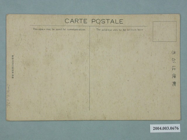 1.本物件為以始政四十周年記念臺灣博覽會,礦山館為主題之明信片,正面為礦山館黑白照片,畫面中可見其建物側面樣貌,主要建物與旁邊鐵塔上皆有「礦山館」字樣,右下有1段文字「始政四十周年紀念台灣博覽會」,左上有1段文字「礦山館」;背面為空白明信片橫式書寫面,以黑色單色印刷,右上處為郵票黏貼處,右側有「郵便はがき」字樣,左側有「廣島精美堂印刷所謹製」字樣,上方有「CARTE POSTALE」及2行字樣,由左至右為「This space may be used for communication」、「The address only to be written here」。2.始政四十年紀念臺灣博覽會為西元1935年10月至11月以臺北為主舉辦的博覽會,目的為宣傳其統治的政績,及臺灣各項政策的成果,主要分為4個會場,第一會場位於臺北公會堂附近,第二會場於今二二八公園,第三會場於迪化街附近,第四會場於陽明山;此一期間各地政府亦有各自舉辦小規模展覽和活動。鑛山館的位置在第一會場的第二府縣館南邊,其目的為宣傳「礦業臺灣」的形象,其展示內容主要以礦業的開採、鍊製為主。